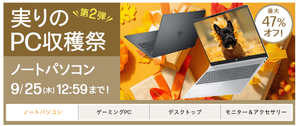 下のリンクより購入していただくと、税込13.2万円以上のノートパソコンが7%オフで購入できます。【広告】【提供:株式会社日本HP】