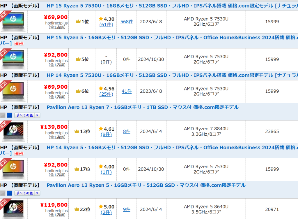 売れ筋商品だと、HPやPavilionシリーズなど低価格帯の機種が大半で、コスパを評価する口コミが多かったです。