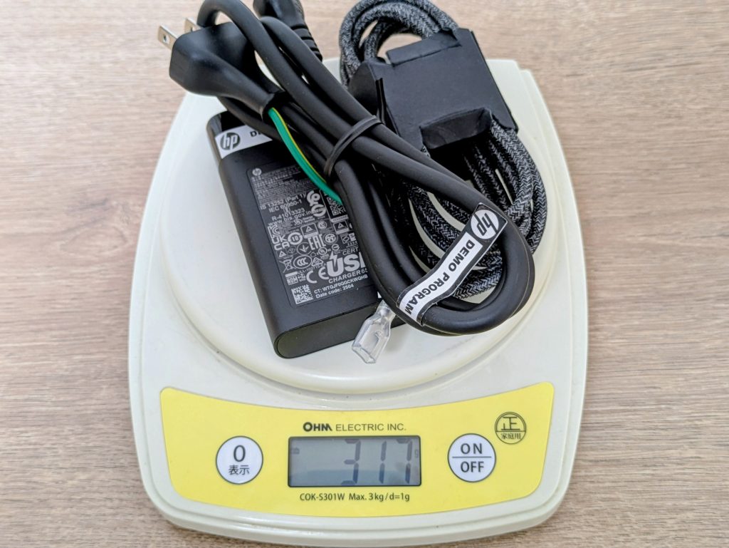 アダプターは出力65Wで317gとなり、重めなのは少し残念です。