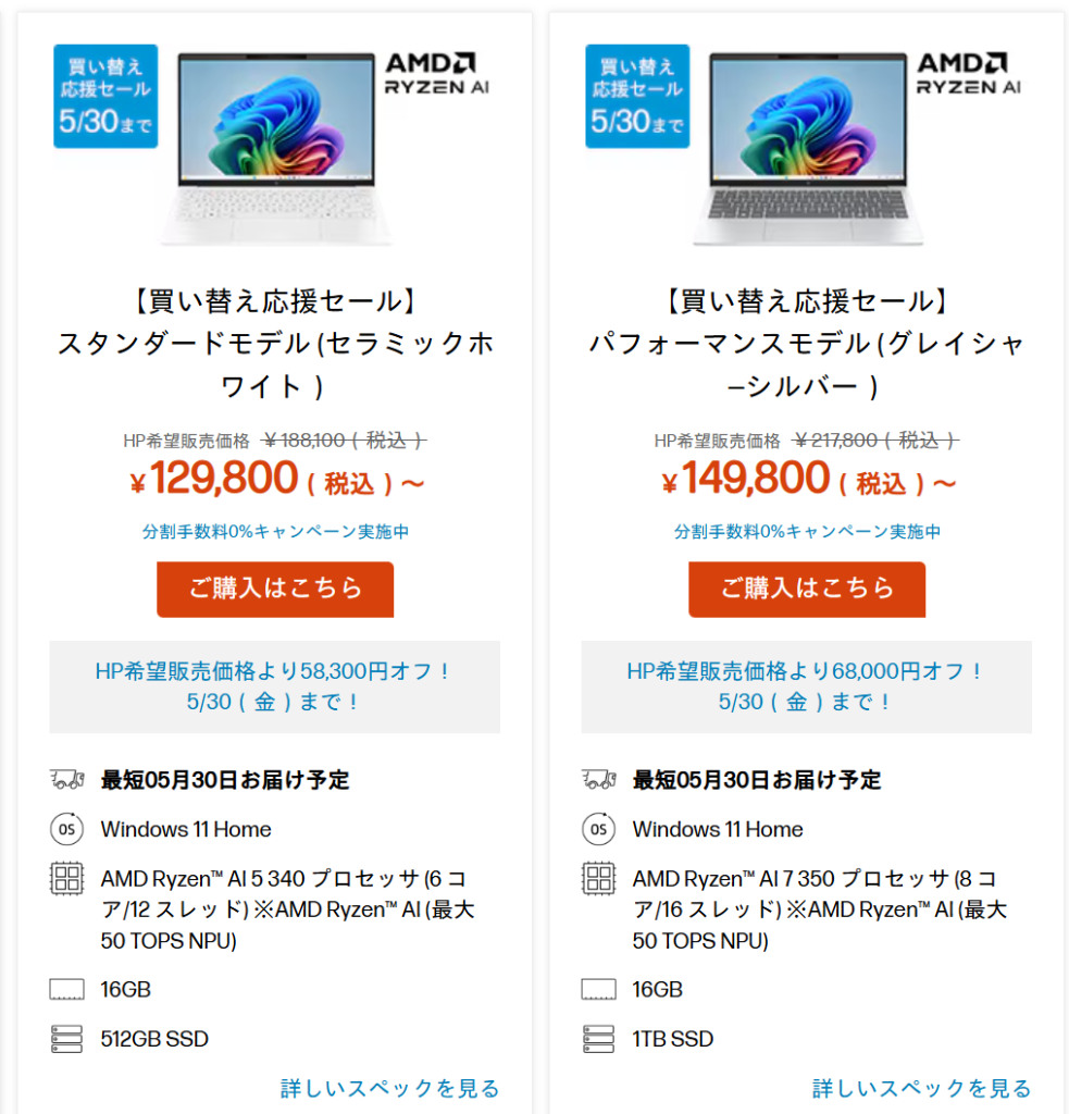 下のリンクをクリックすると7%オフが適用され、税込13.2万円以上のノートパソコンが7%オフで購入できます。【広告】【提供:株式会社日本HP】
