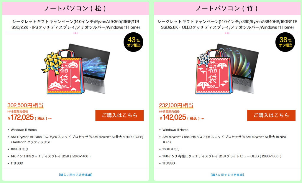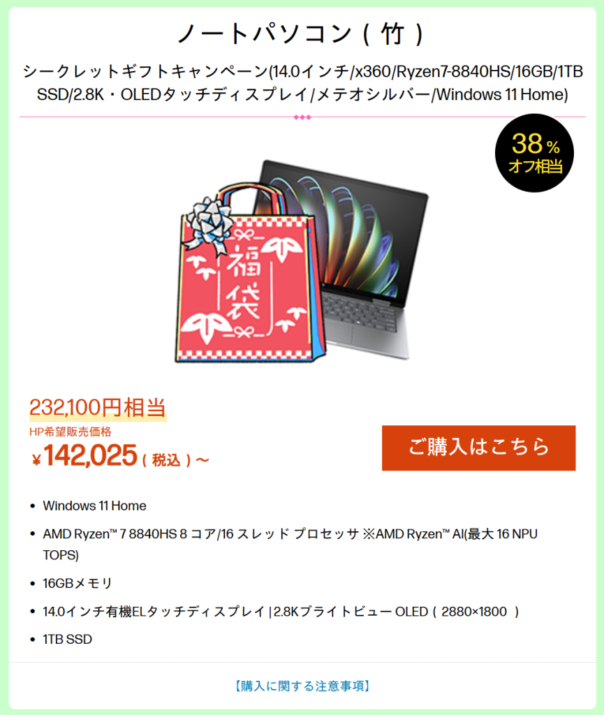 上記の福袋はHP Envy x360 14-faのRyzen 7 8840HS,有機EL構成です。