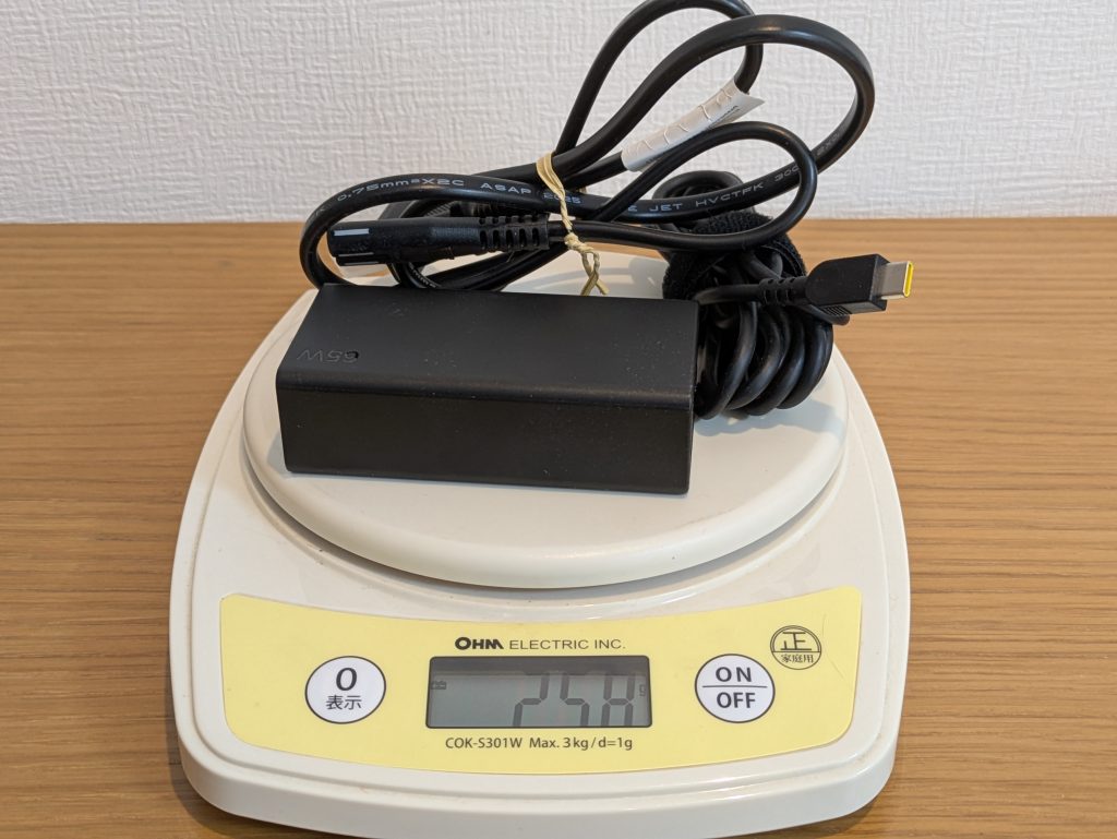 持ち運びも考慮するなら、電源アダプターはUSB Type-C対応の軽量でコンパクトなものを買ってしまったほうがよいと思います。私も購入しています。