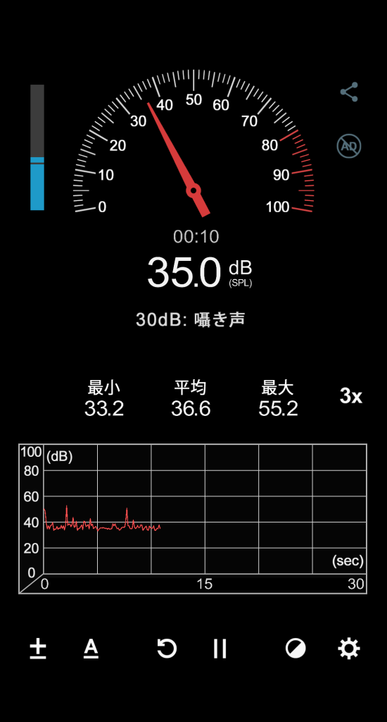 この間、ファンの音はそれなりにうるさく、騒音計で測定すると35db程度となっていました。