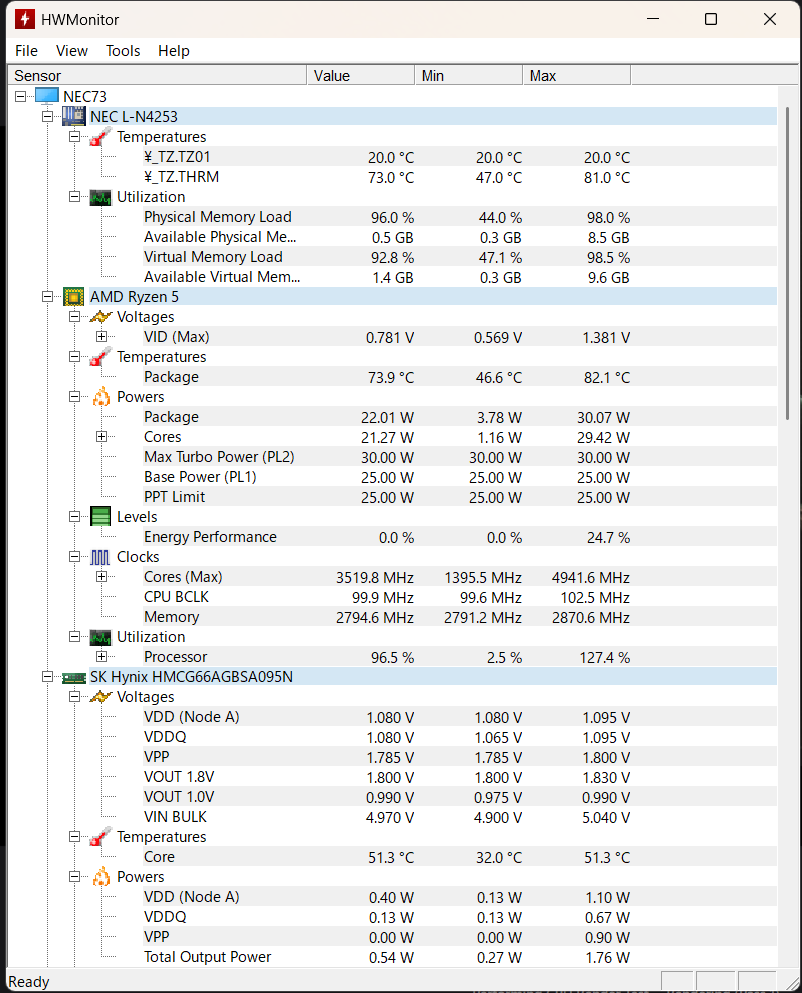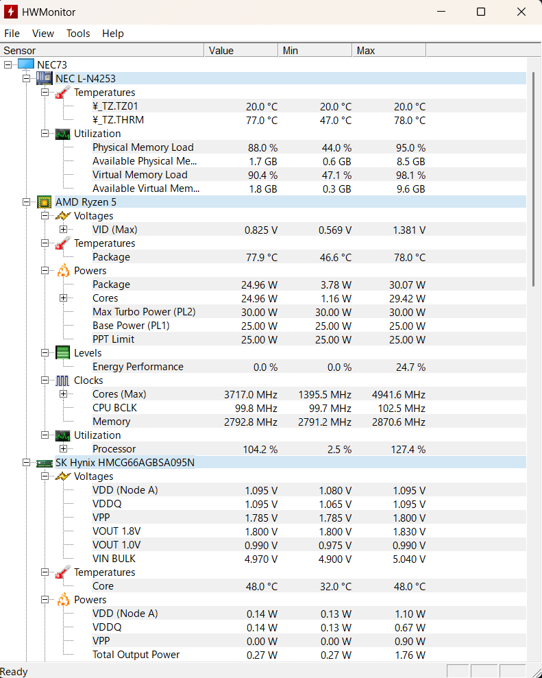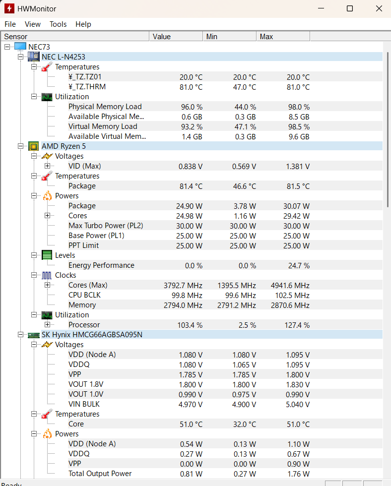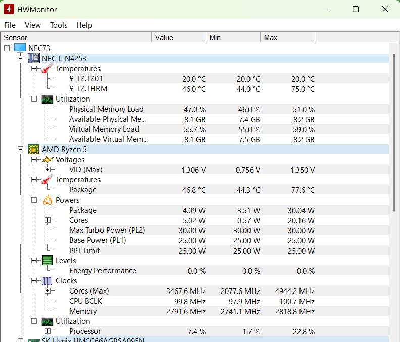 CPU電力は、負荷をかけると25W前後まで上がり、維持し続けます。