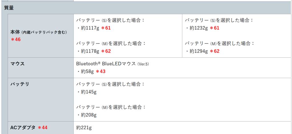LAVIE Direct N14 Slimは、ディスプイとバッテリーの大きさにより、重さが変わります。約1.1kgの構成とするには、タッチネルでバッテリーSとする必要があります。