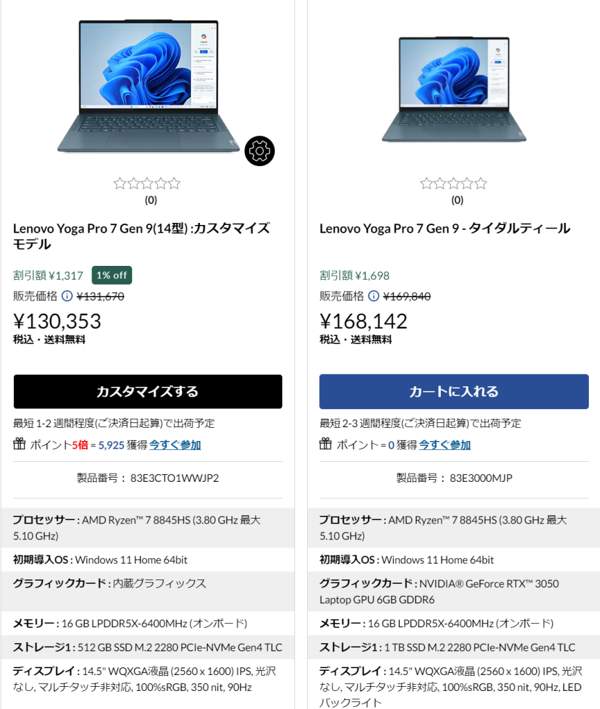 Yogaシリーズのほうが、ボディの高級感があるので、スペックだけでコスパを判断はできませんが、比較検討したうえで選ぶのがよいと言えます。