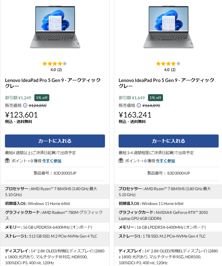 ただ、下位グレードのIdeaPad Pro 5 Gen9は、さらにコスパが良く、比較検討してみるのが良いといえます。